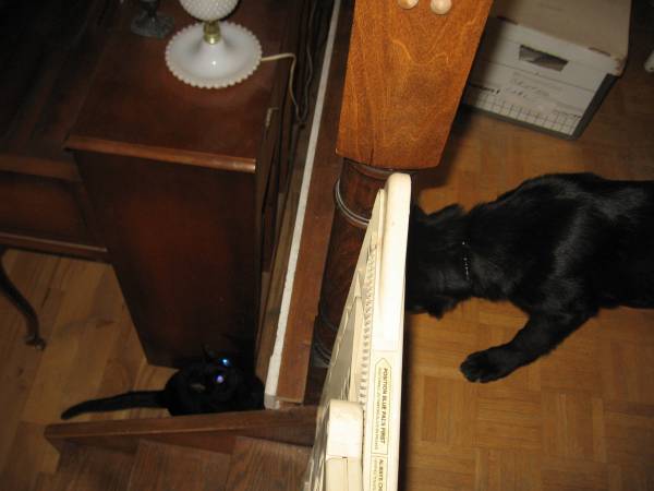 Few more pics...Eska and the cat are gradually working things out. Very hard to get good pics, though, as my camera has quite a lag between the time I press the shutter button and the time the photo actually takes. So, if the cat is taking a swat at the puppy's nose, I miss it completely.